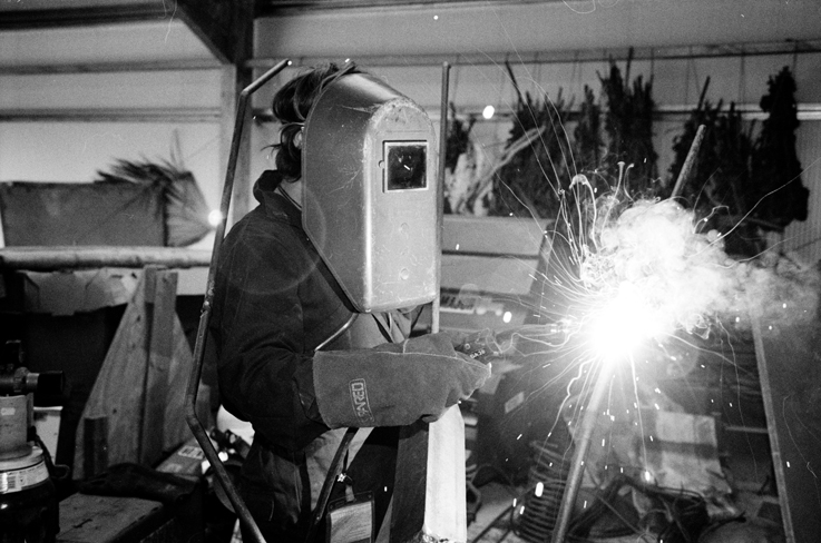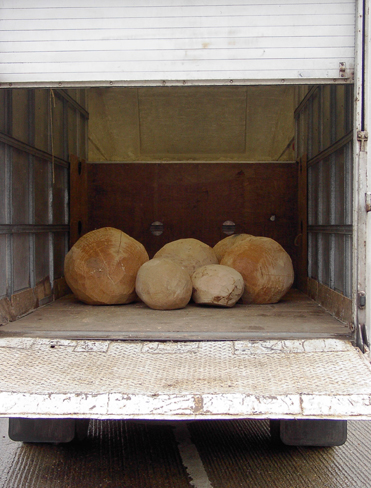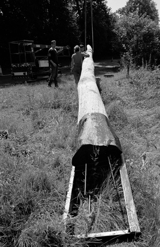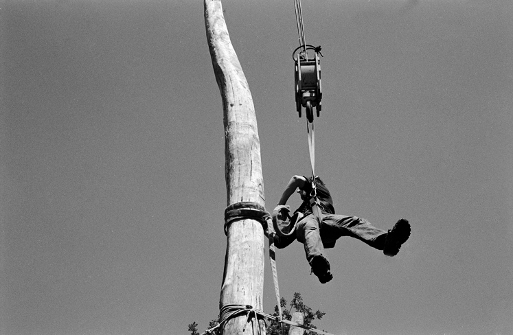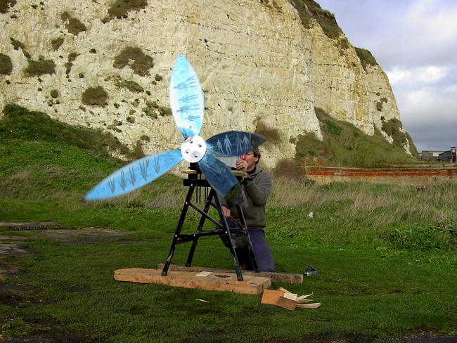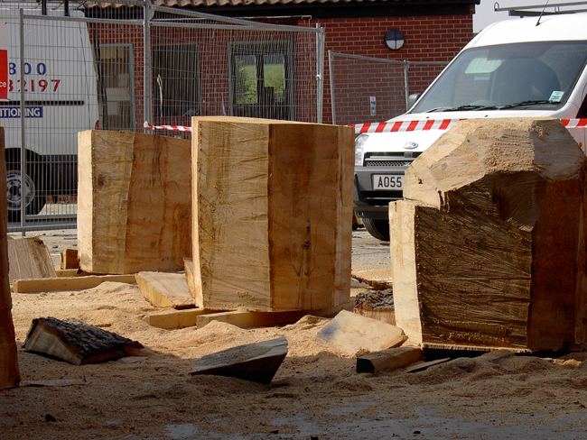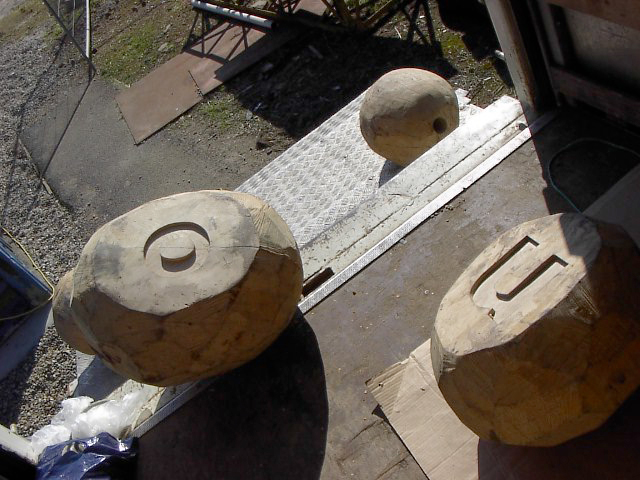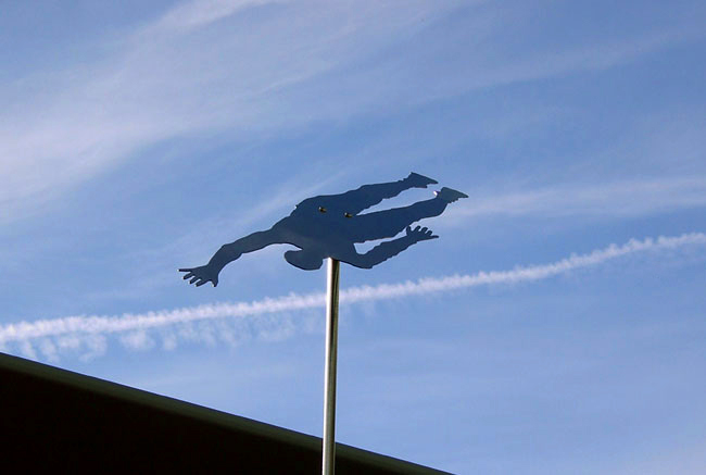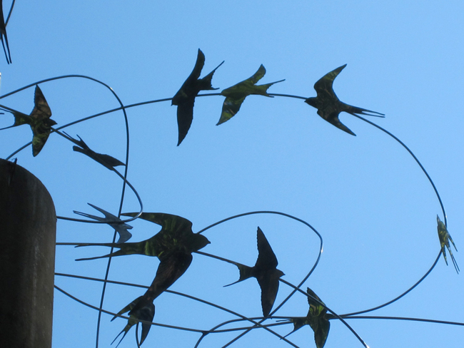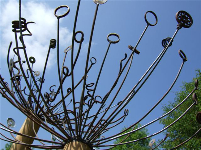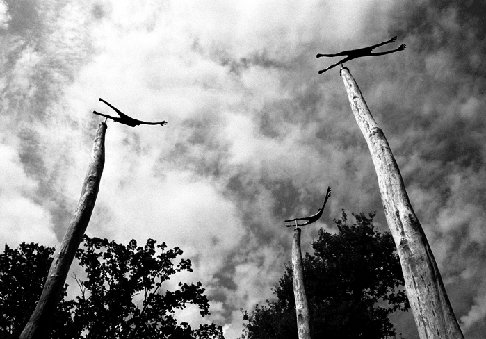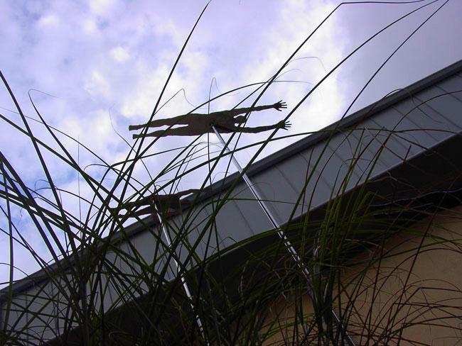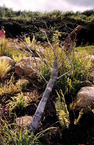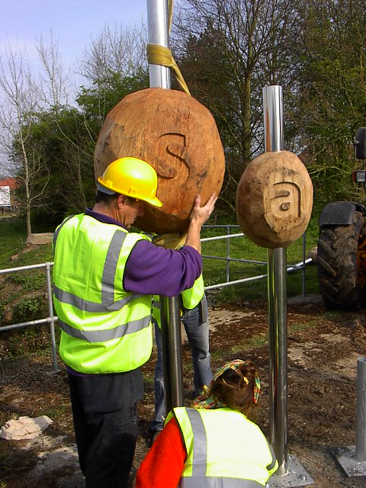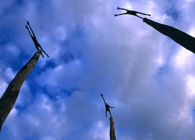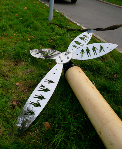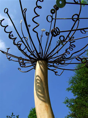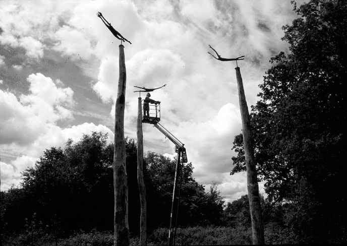 oak tree trunks, bronzed resin, stainless steel bearing mechanisms allowing the figures to turn with the wind.