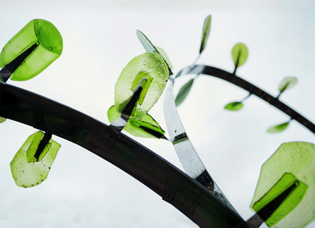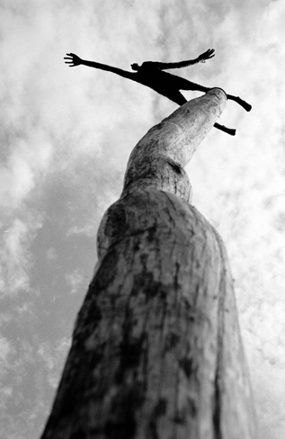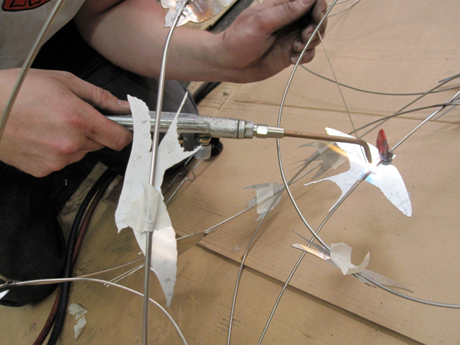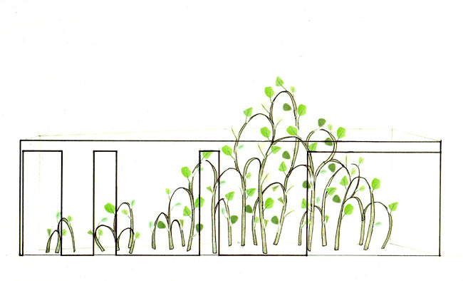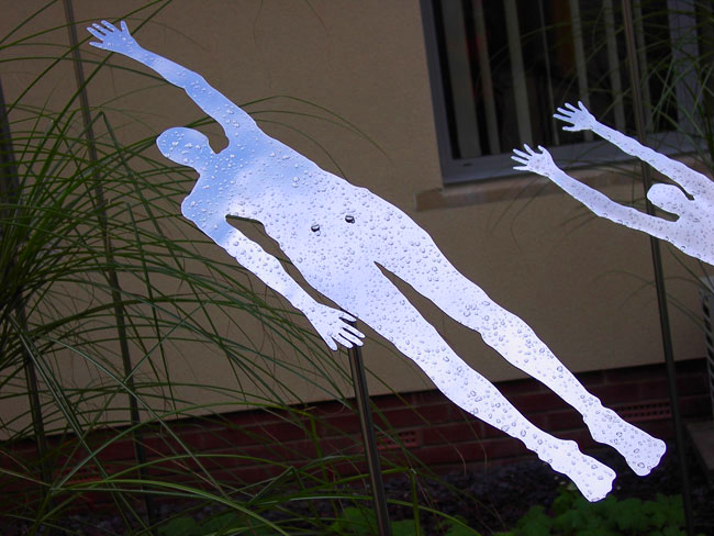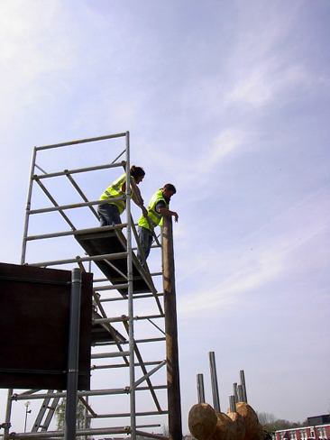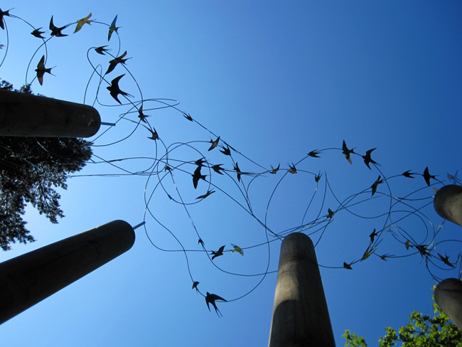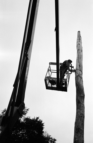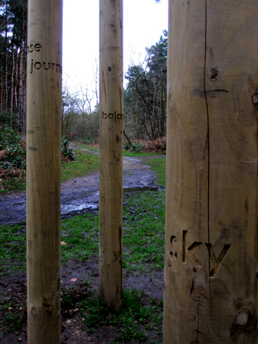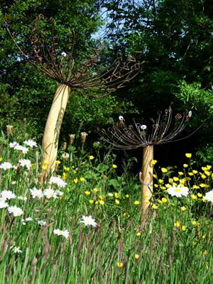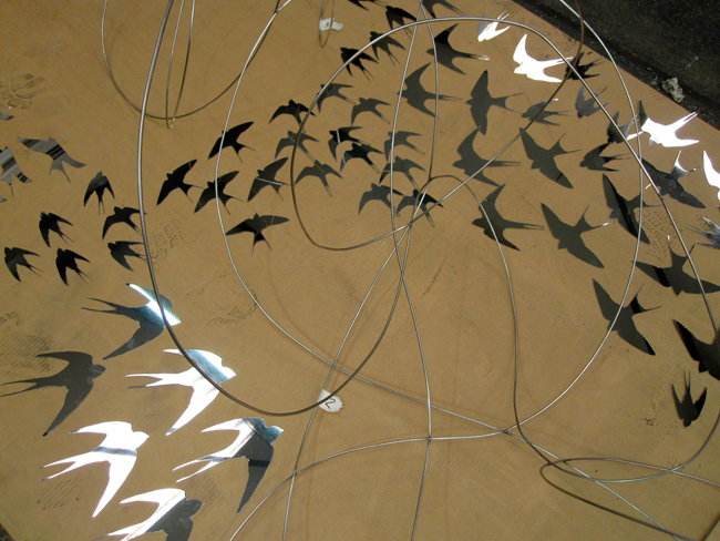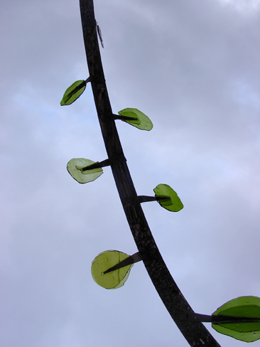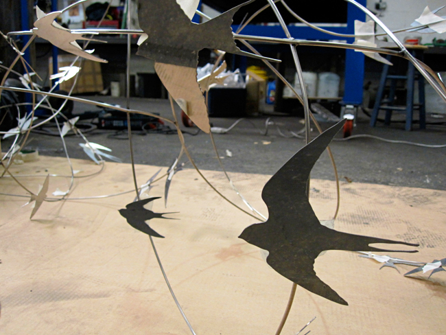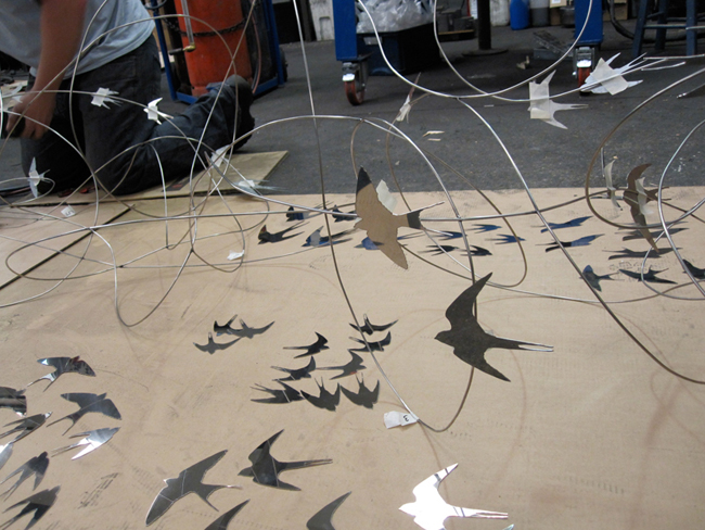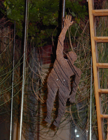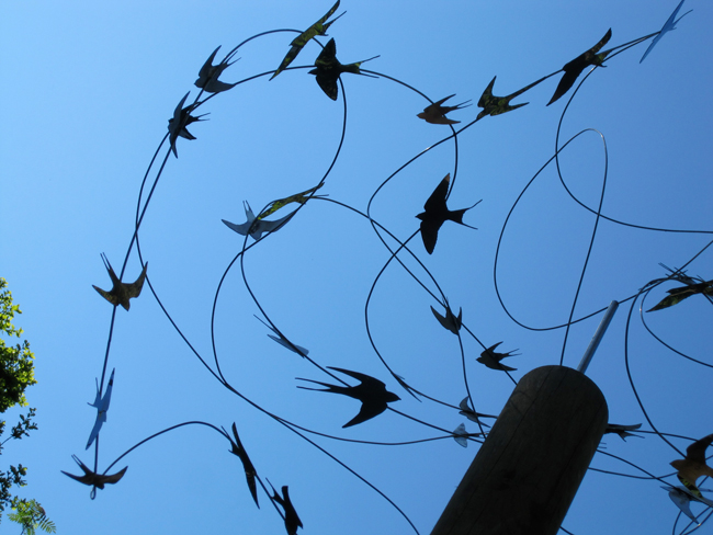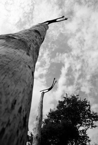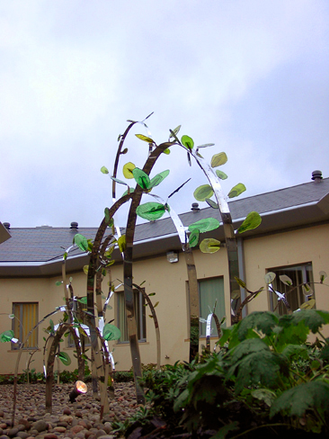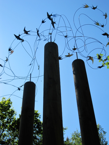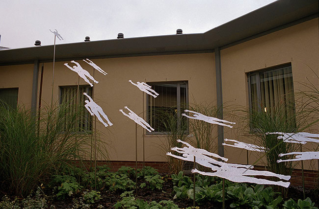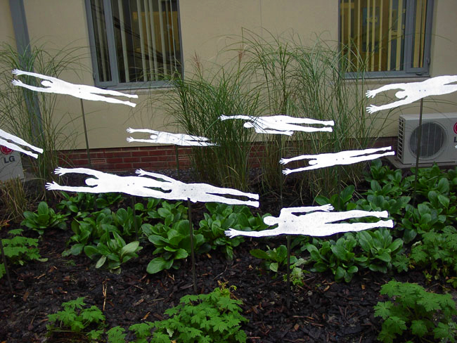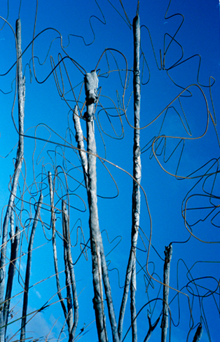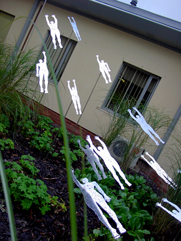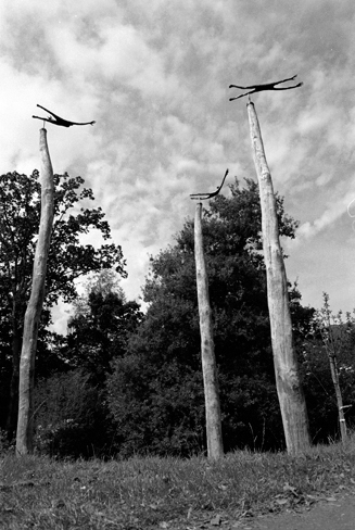 Laser cut stainless steel silouettes, radiata pine poles, stainless steel wire