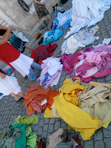 Collected clothes from the recycling centre hung in the town square and used as a backdrop for performances.